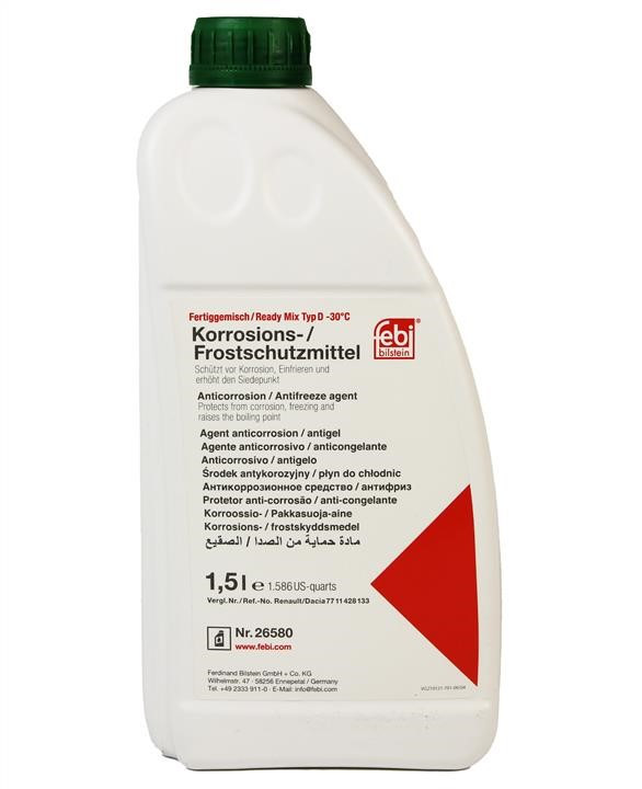 Охолоджуюча рідина Febi, G11 (зелений) повністю відповідає спеціальним вимогам виробників автомобілів і забезпечує надійний захист від пошкоджень, що викликаються замерзанням, корозією та кавітацією.